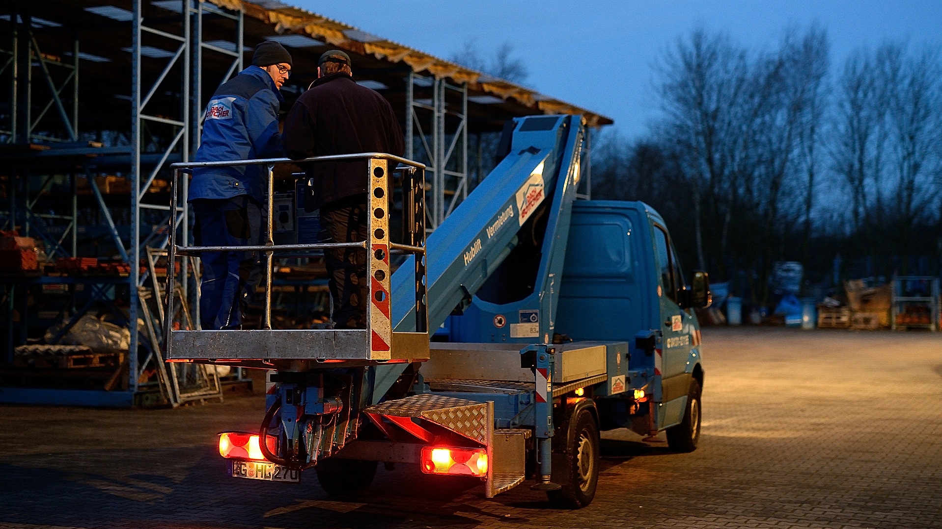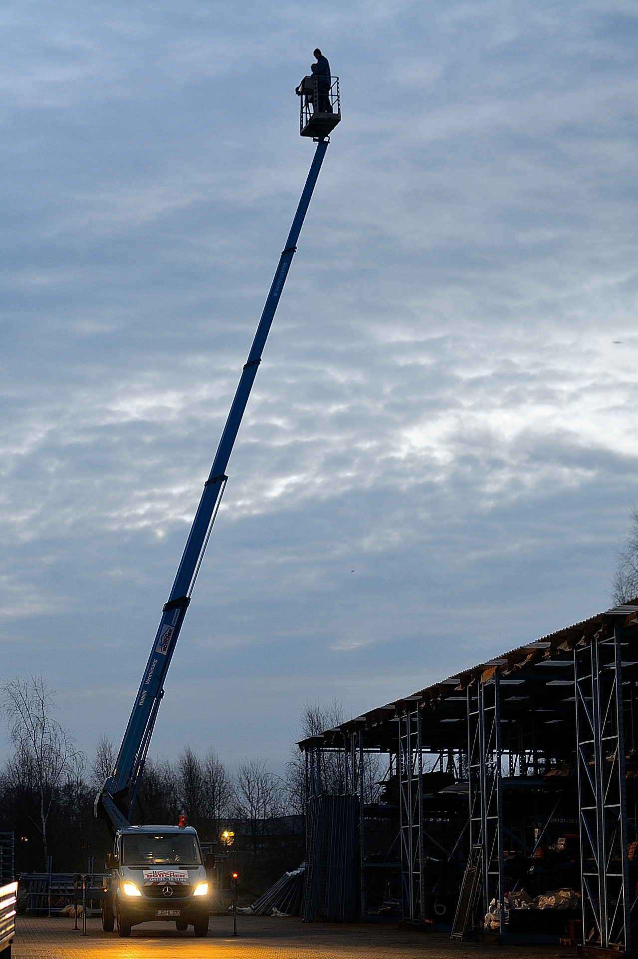 LKW-Hubarbeitsbühnen im Einsatz. Hier ein früher Vogel. (Smartphone bitte 1x drehen. Danke!)